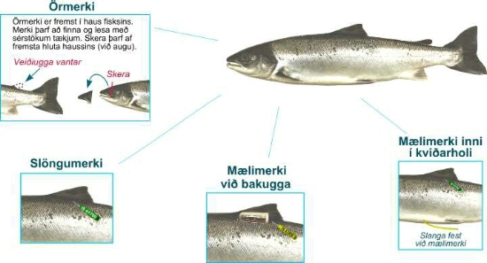 Slöngumerki með númerum, s.k. Spaghetti eða Floy merki. Merkin eru til í mismunandi litum. Þau eru fest í fiskinn neðan við bakugga og sjást utan á honum.
