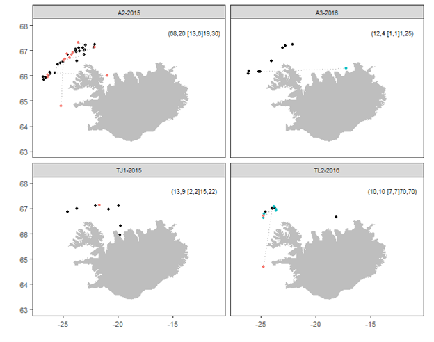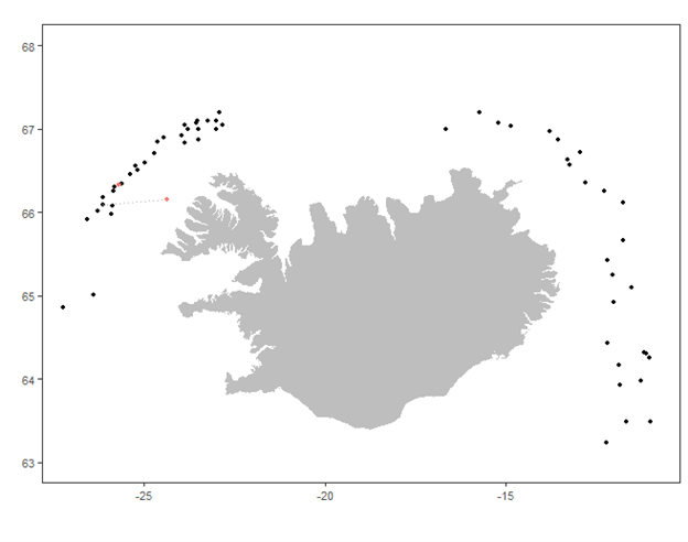 Það hafa aðeins endurheimst tveir hlýrar úr merkingunni vorið 2021; annar fiskurinn veiddist viku eftir merkingu á svipuðum stað og hann var merktur á, hinn um mánuði eftir að hann var merktur, um 70 km austan við merkingastaðinn (2. mynd).