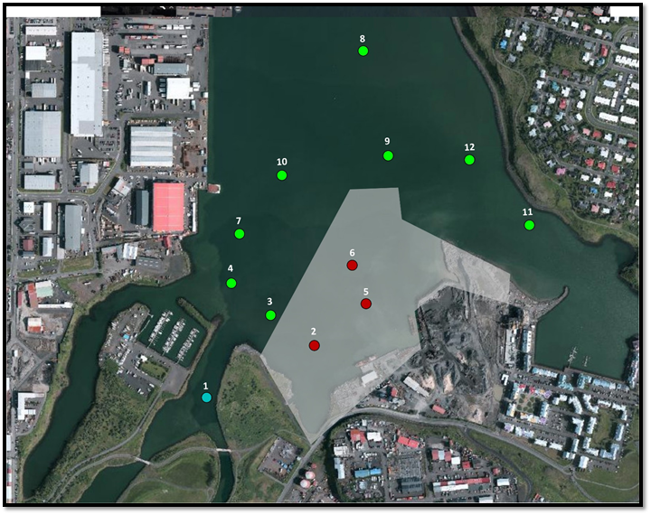 Staðsetning og númer hlustunardufla í Elliðaárvogi árið 2018. Græn dufl eru utan fyrirhugaðs landfyllingarsvæðis, rauð dufl eru innan þess landfyllingarsvæðis og blátt dufl er í ósi Elliðaá. Skyggði flöturinn sýnir áætlaða landfyllingu samkvæmt skipulagslýsingu deiliskipulags. Duflin námu hljóðmerki frá merktum gönguseiðum svo hægt var að kortleggja leið gönguseiða á haf út. Í þessu verkefni voru taldar litlar líkur á að landfylling hindri seiðin á för þeirra út í sjó.