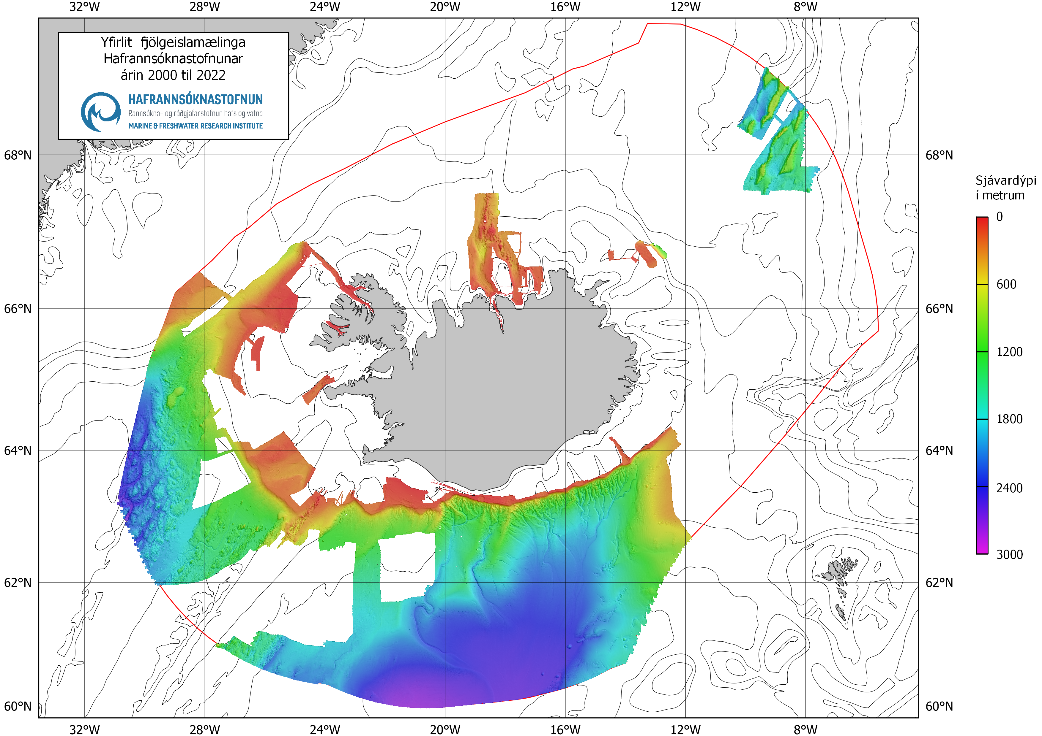 Á myndinni má sjá þau svæði sem hafa verið kortlögð með fjölgeislamælingum á vegum stofnunarinnar á árunum 2000-2023.