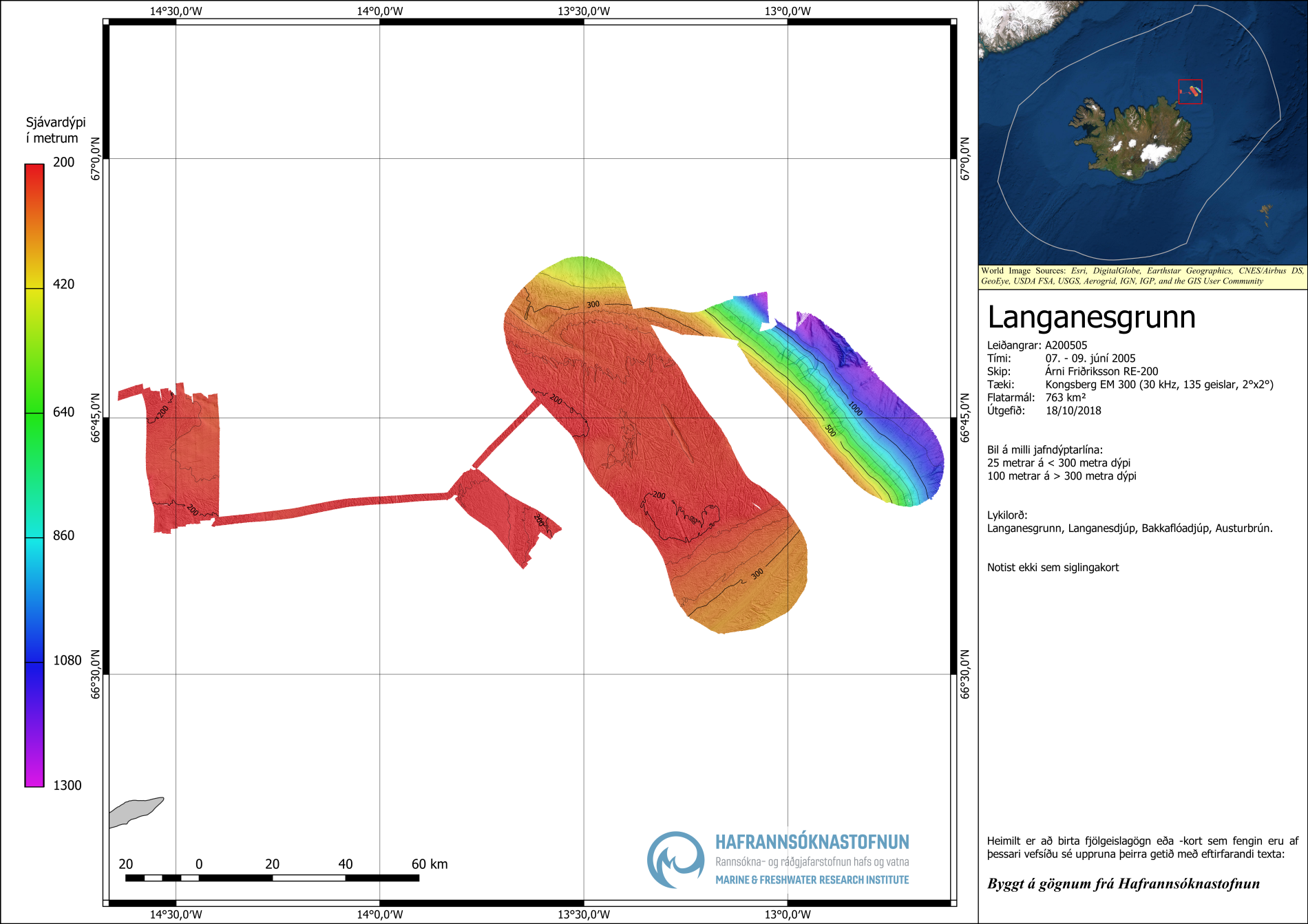 Úrvinnsla: Hreinsun fjölgeislagagna var gerð í Caris hugbúnaði með 20 x 20 m reitun í vörpun ISN2004.