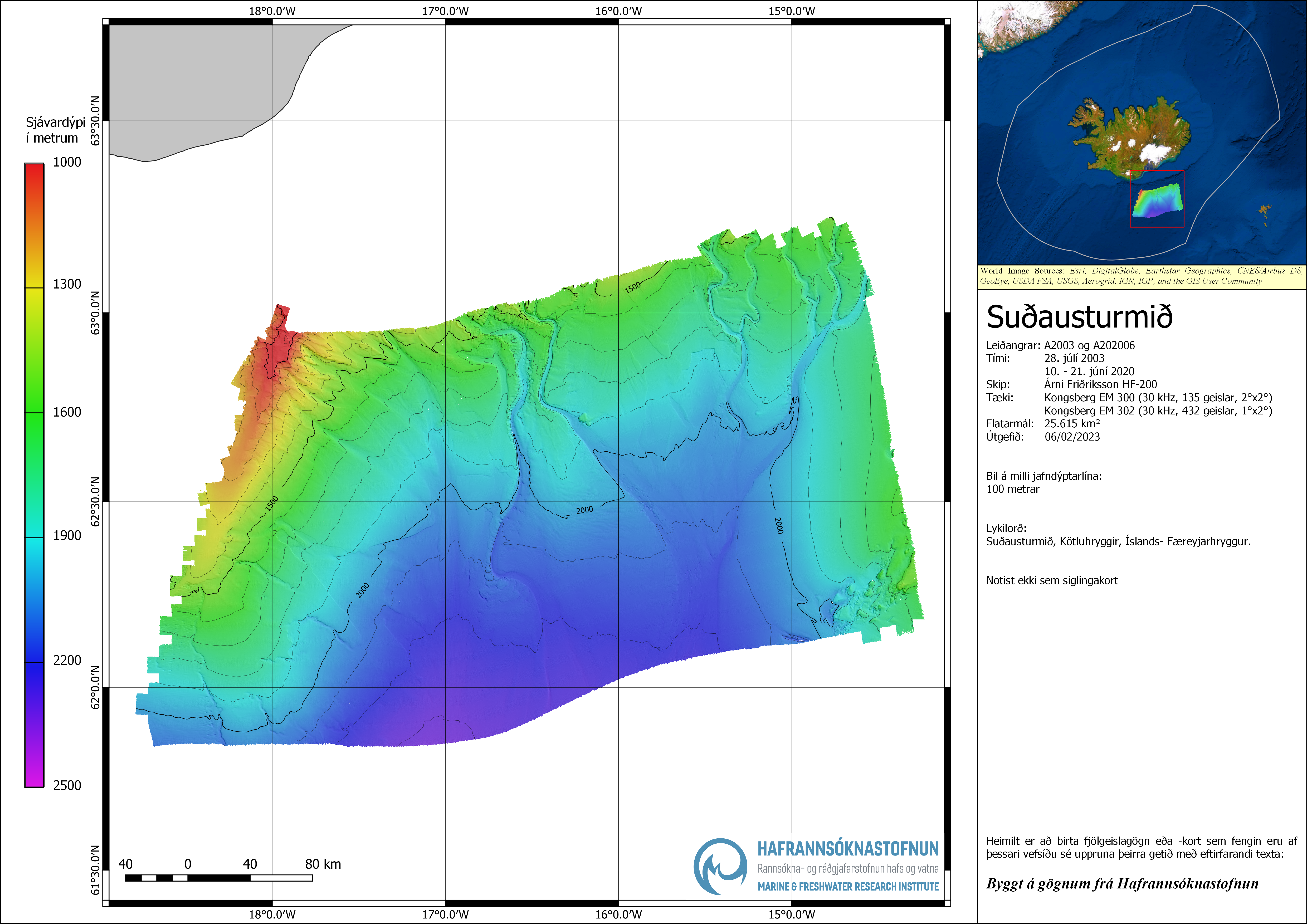 Heimilt er að birta fjölgeislagögn eða -kort sem fengin eru af þessari vefsíðu sé uppruna þeirra getið með eftirfarandi texta: Byggt á gögnum frá Hafrannsóknastofnun.