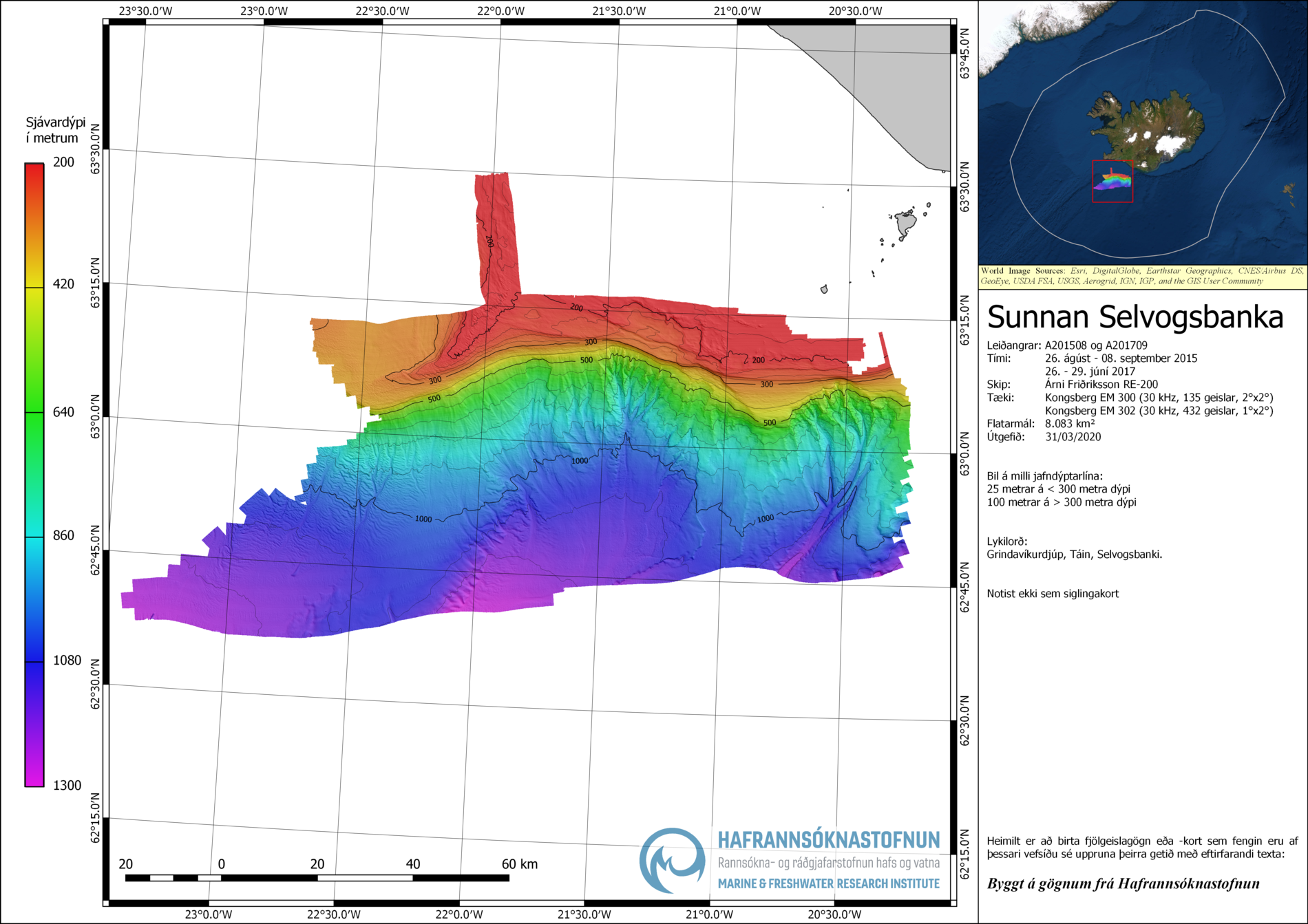 Úrvinnsla: Hreinsun fjölgeislagagna var gerð í Caris hugbúnaði með 20 x 20 m reitun í vörpun ISN2004.
