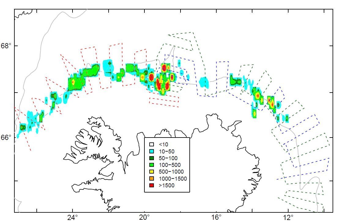 Bráðabirgðaniðurstaða loðnumælinga dagana 1.-9. febrúar liggur nú fyrir. Heildarmagn hrygningarloðnu samkvæmt henni er 250 þúsund tonn og hefur þá ekki verið tekið tillit til áætlaðra affalla úr stofninum vegna afráns fram að hrygningu. Þessi mæling byggir á yfirferð sem í þátt tóku RS Árni Friðriksson og uppsjávarveiðiskipin; Aðalsteinn Jónsson SU, Börkur NK, Margrét EA og Polar Amaroq. Mest reyndist vera af loðnu við Kolbeinseyjarhrygginn en einnig fannst loðna við landgrunnskantinn norðaustur og norðvestur af landinu (mynd).