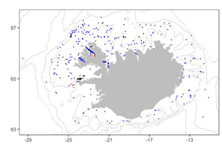 Fundarstaðir hrossarækju við Ísland. Rauðir punktar eru úr trolli, svartir úr skjóðu og bláir úr fæðusýnum. Línurnar sýna 200, 500 og 1000 m dýptarlínur.