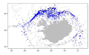 Fundarstaðir ísrækju við Ísland. Rauðir punktar eru úr trolli, svartir úr skjóðu og bláir úr fæðusýnum. Línurnar sýna 200, 500 og 1000 m dýptarlínur.