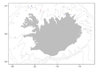 Fundarstaðir litla þvara við Ísland. Rauðir punktar eru úr trolli, svartir úr skjóðu og bláir úr fæðusýnum. Línurnar sýna 200, 500 og 1000 m dýptarlínur.