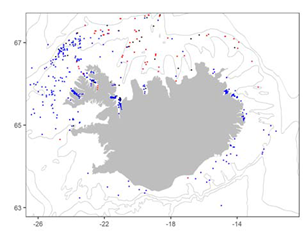 Fundarstaðir sabinsrækju við Ísland. Rauðir punktar eru úr trolli, svartir úr skjóðu og bláir úr fæðusýnum. Línurnar sýna 200, 500 og 1000 m dýptarlínur.